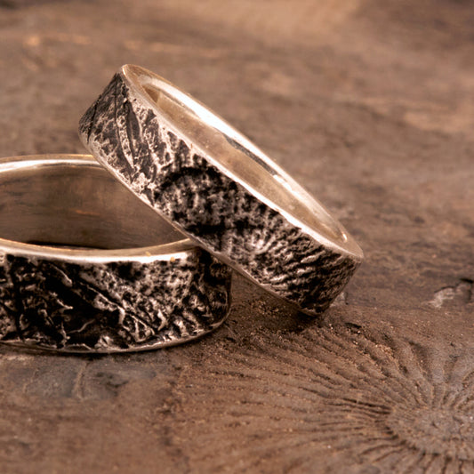 Eheringe Set für Naturverbundene Trauringe mit versteinerten Ammoniten versteinerte Schnecke von der schwäbischen Alb 925 Silber Schieferstruktur Trauringe mit Symbolik handgemacht aus Deutschland