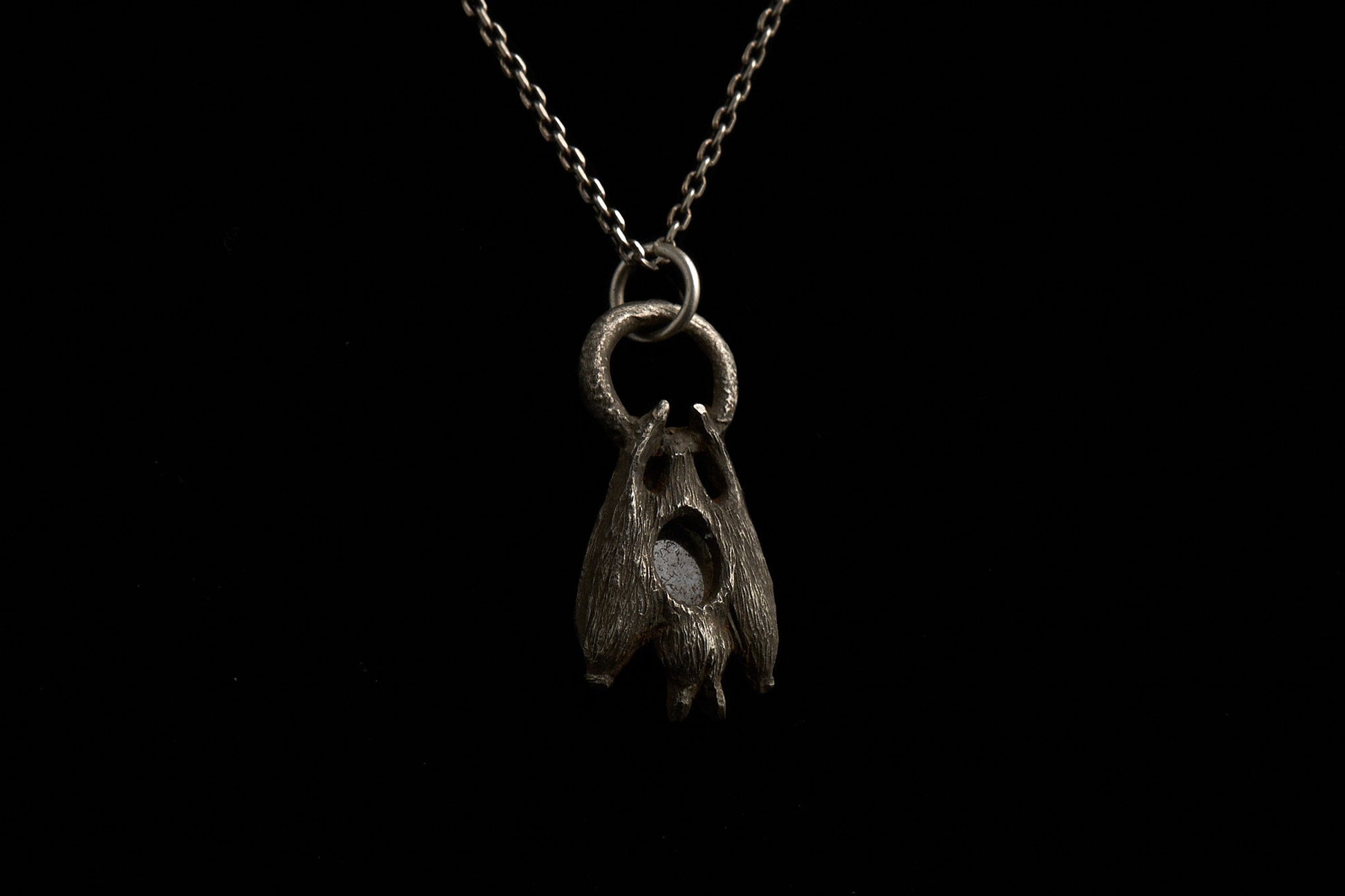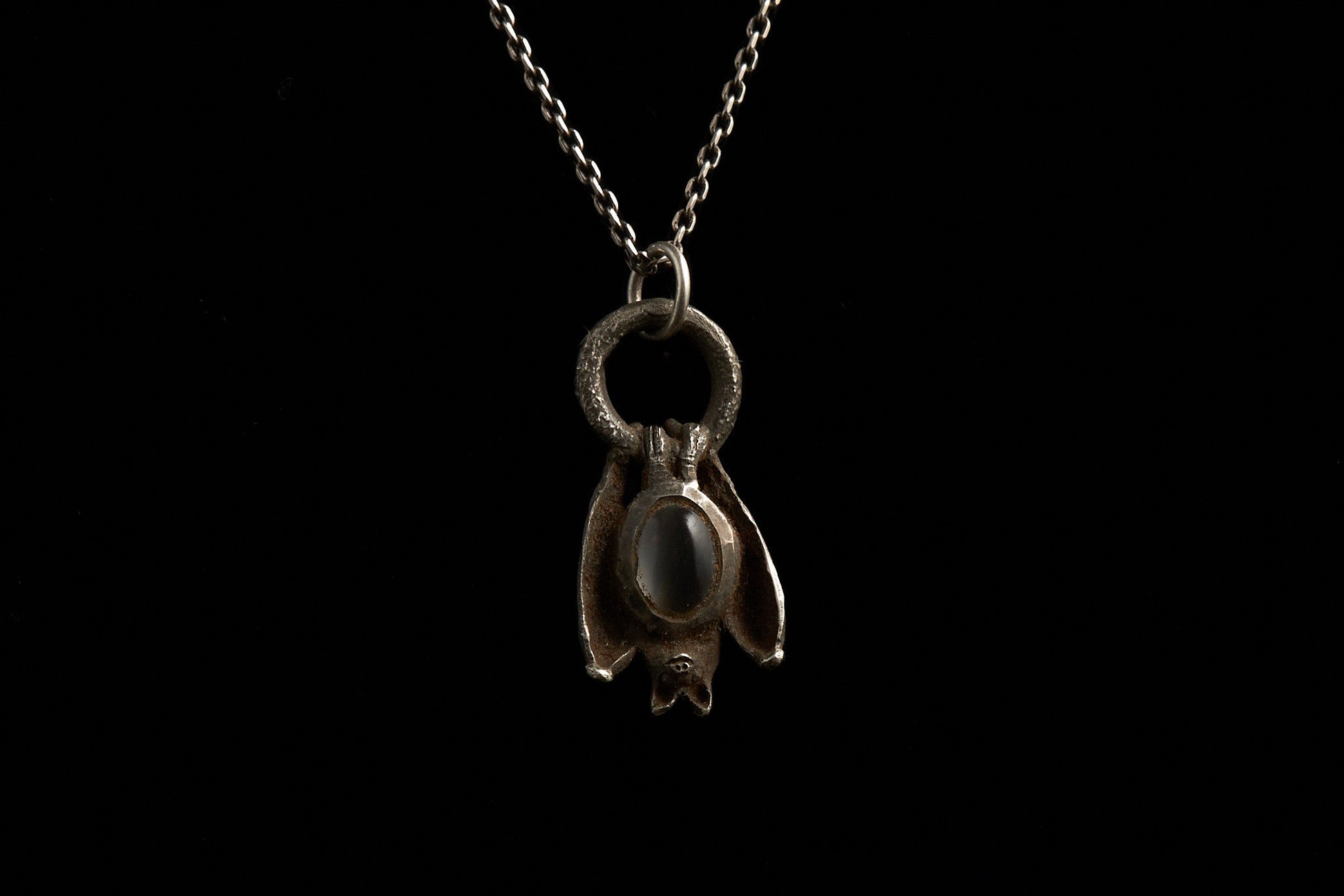 . er zeigt eine am Ring hängende Fledermaus. Der Anhänger besteht aus 925 Silber. De Bauch der Fledermaus beherbergt einen 8x6mm Mondstein Cabochon. Der Anhänger ist 26mm hoch, 12mm breit und mit Stein etwa 5mm tief. Er wiegt etwa 3,5g. Der Anhänger kann sowohl an einer Kette getragen werden als auch an einem Lederband. Die abgebildete Kette gehört nicht zum Lieferumfang kann aber bei mir im Shop erworben werden.