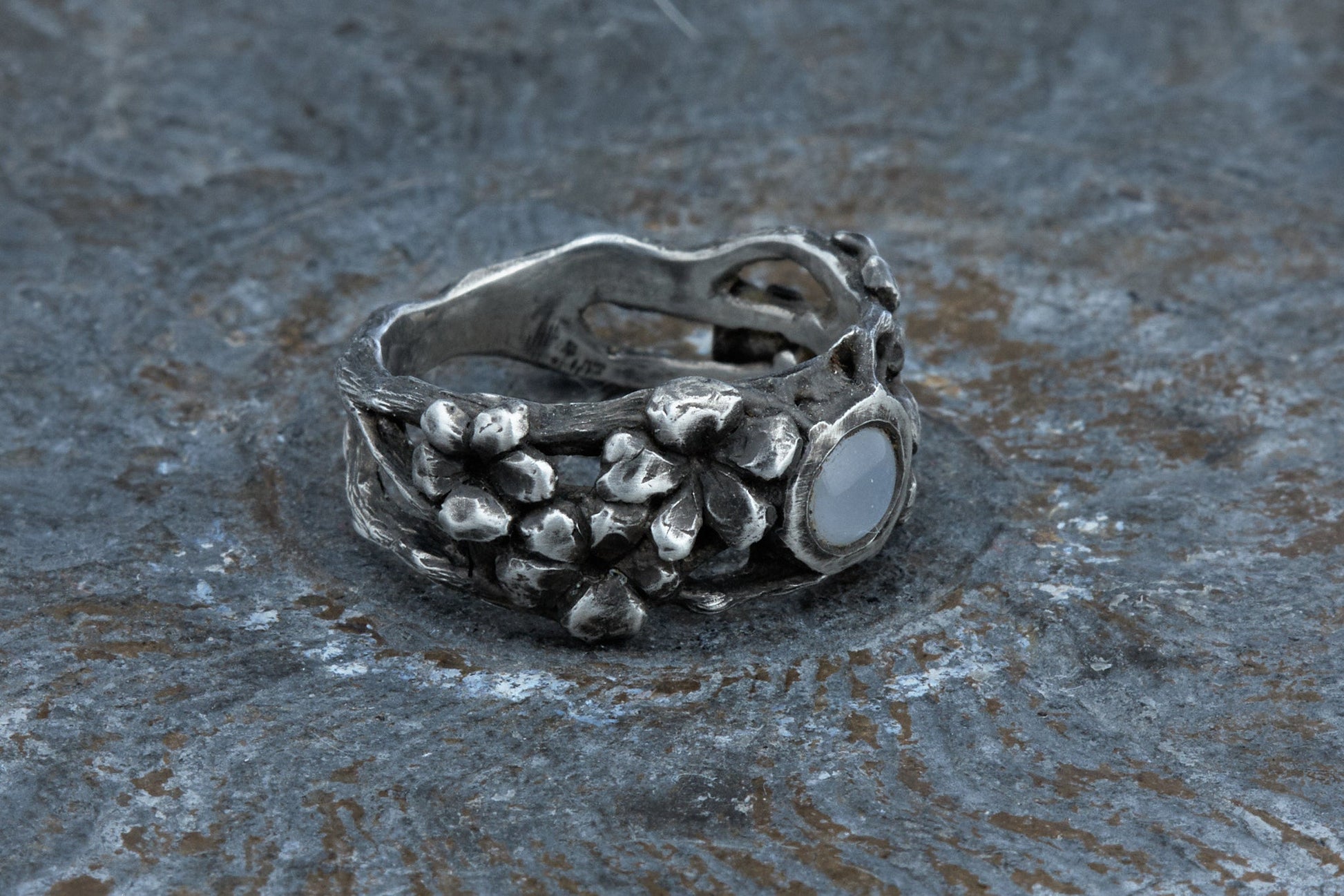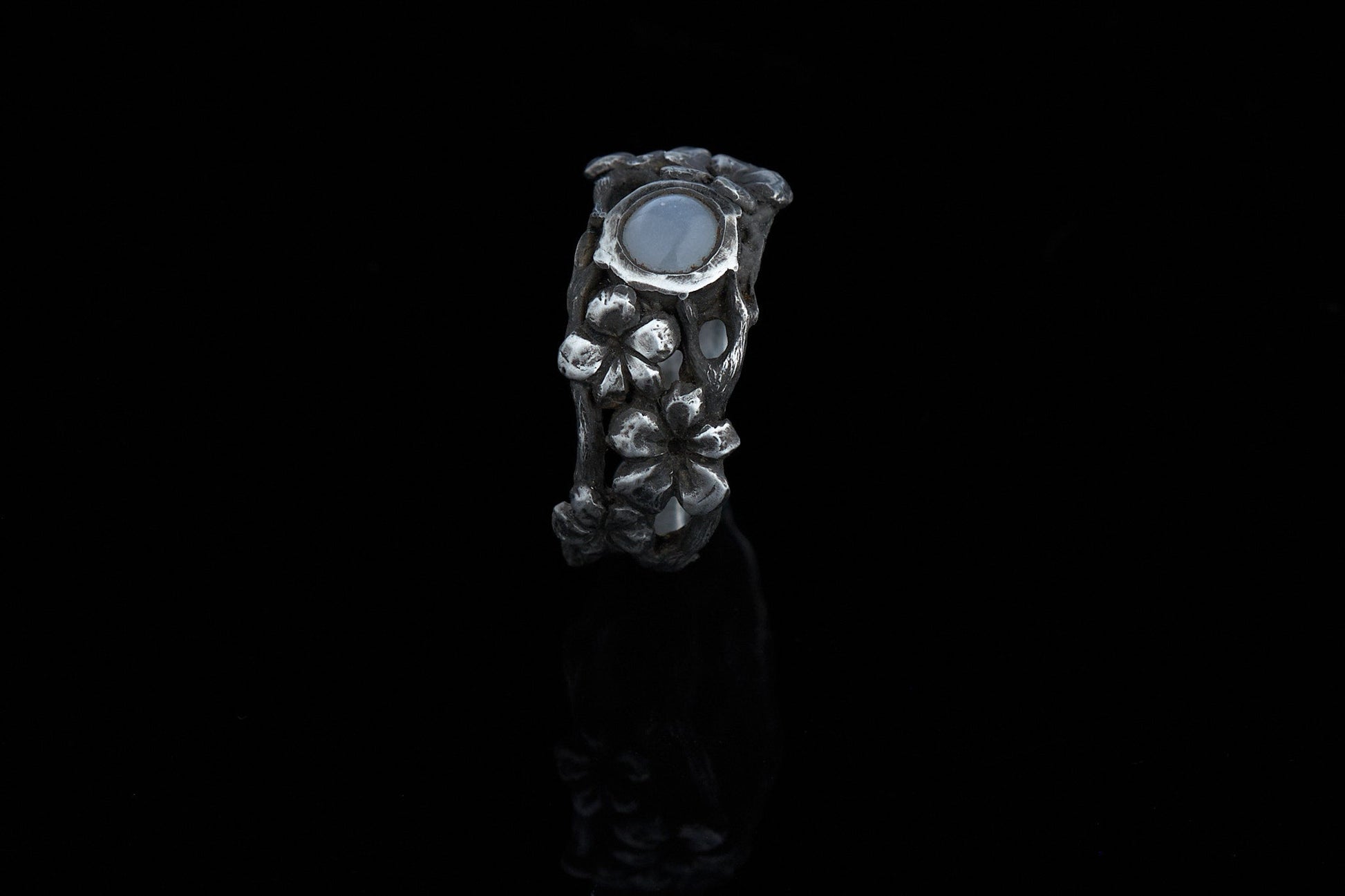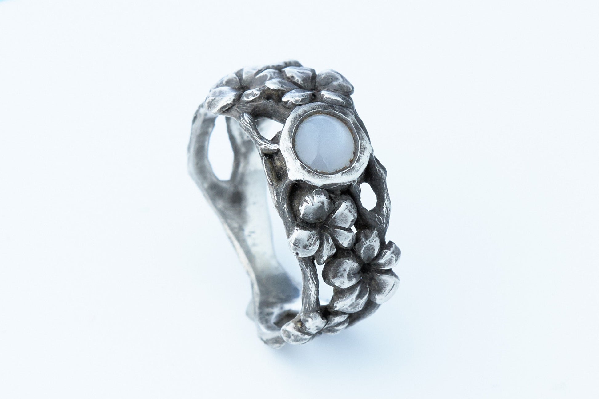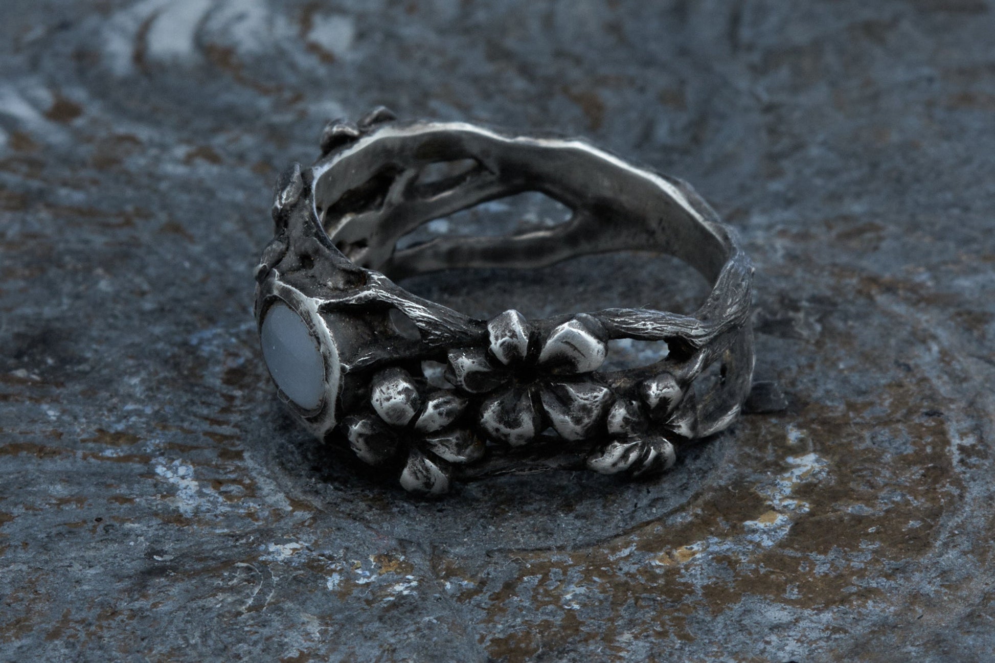 Kirschblüten Baum Ring mit Mondsteincabochon aus 925 Silber geschwärzt