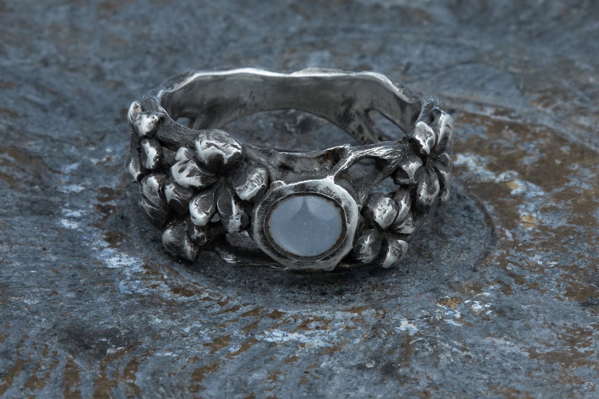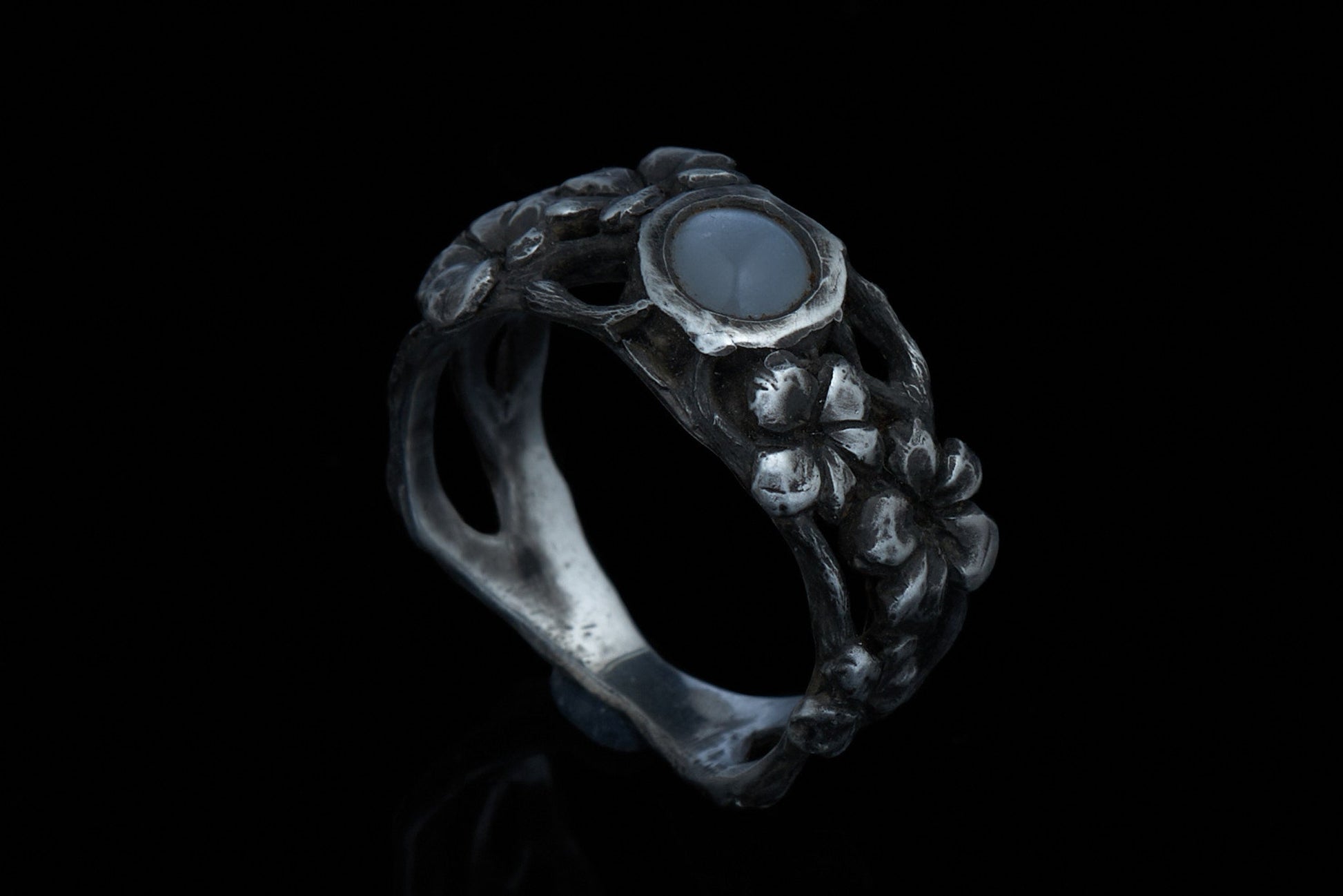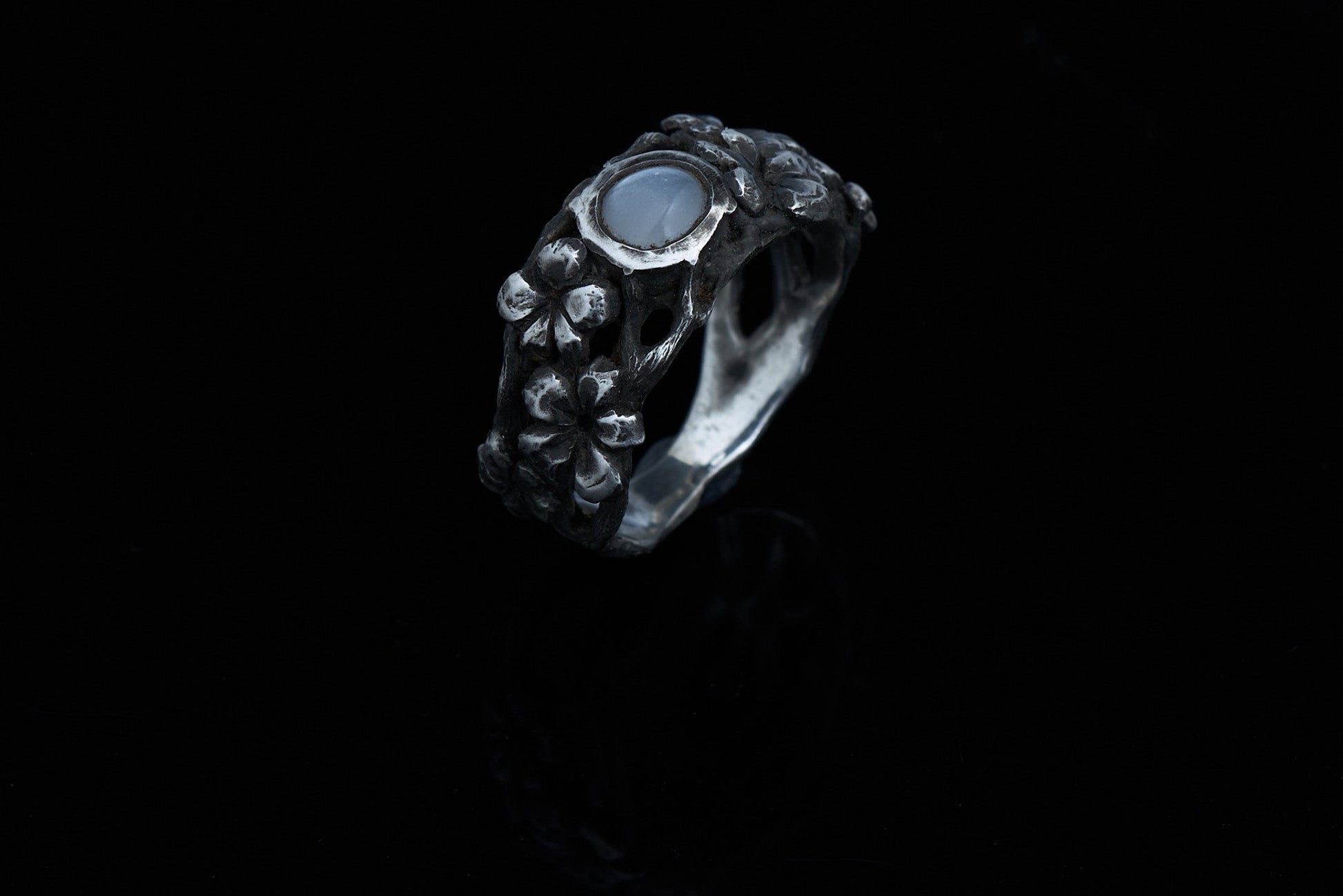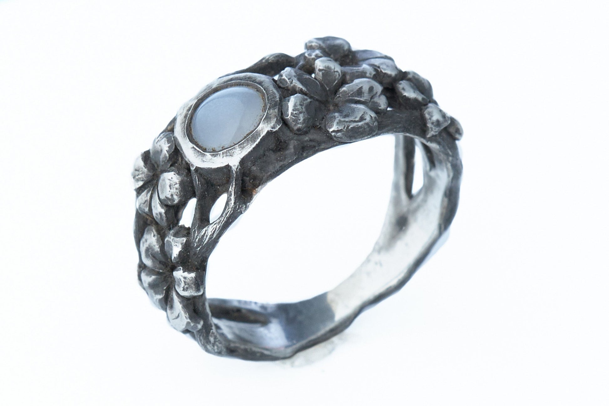 Kirschblüten Baum Ring mit Mondsteincabochon aus 925 Silber geschwärzt