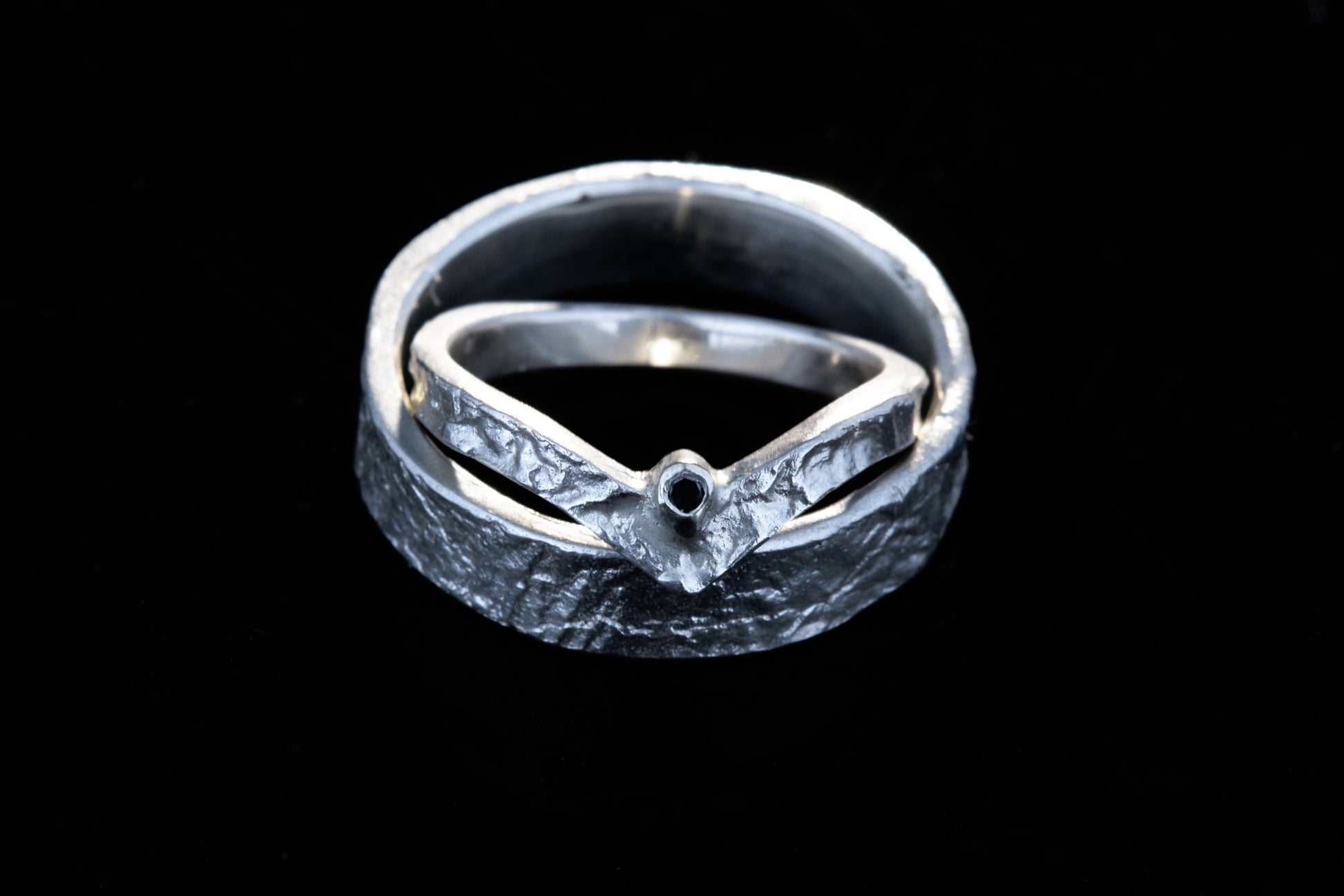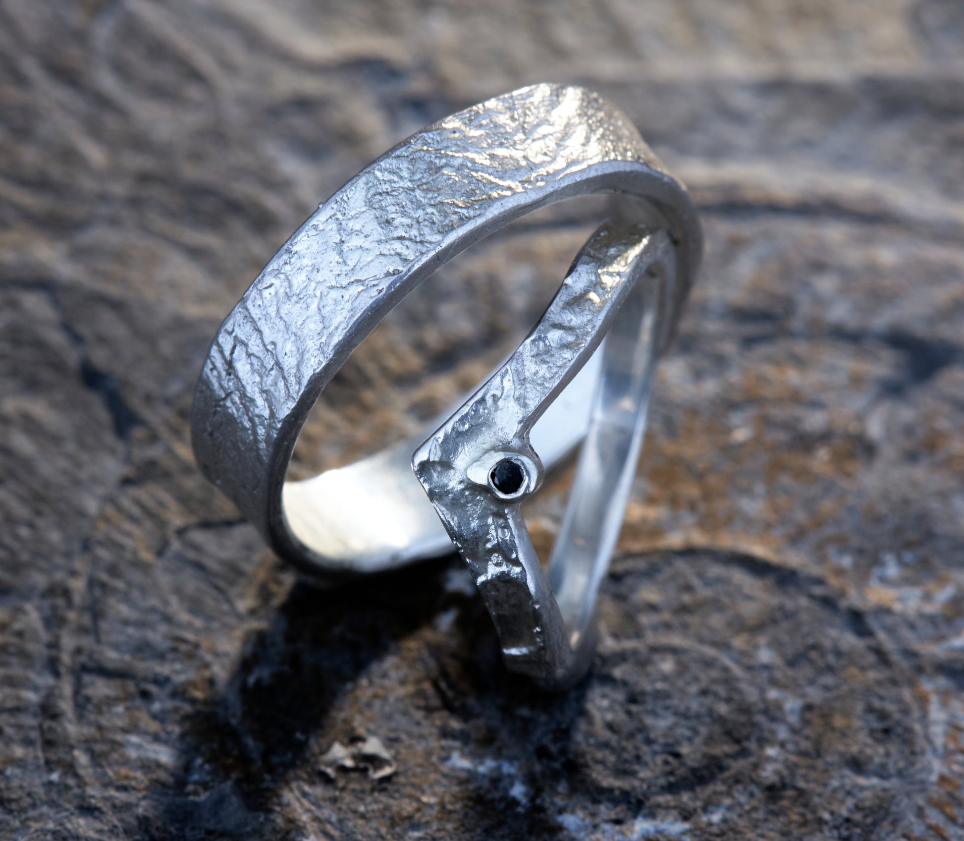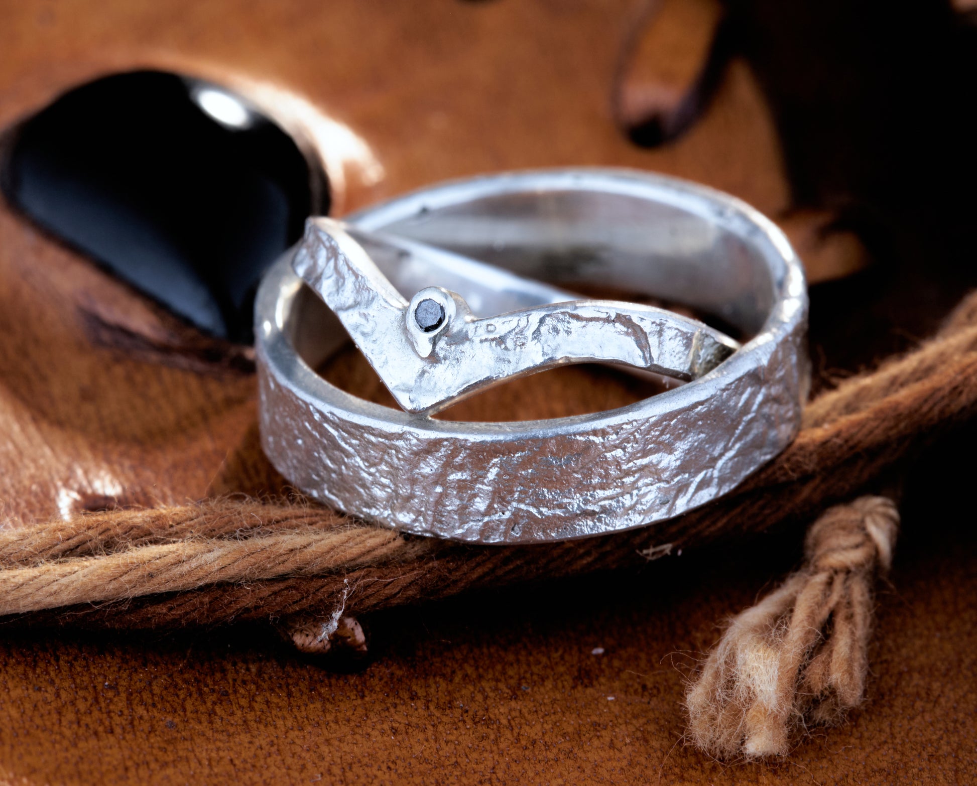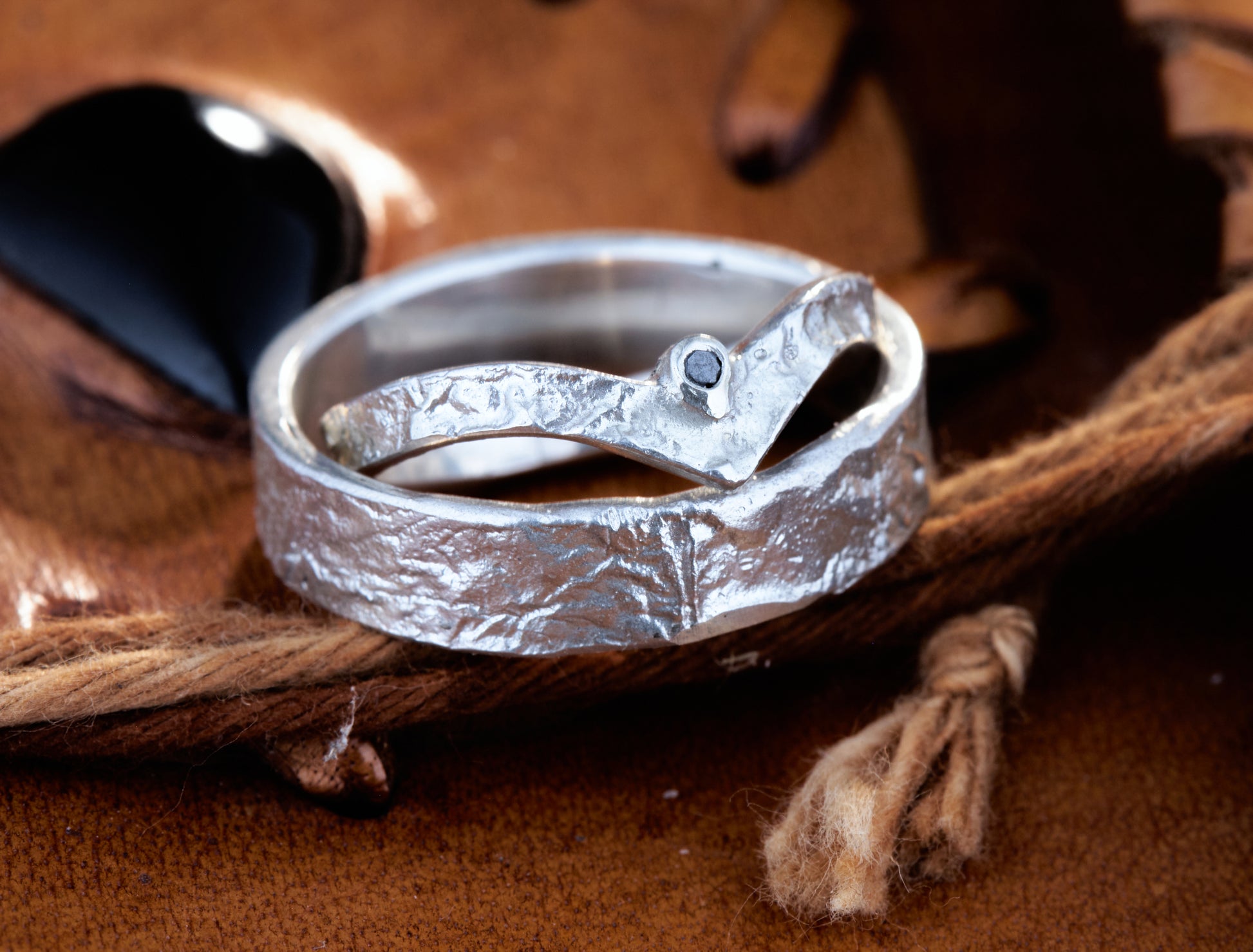 Entdecken Sie die kraftvolle Eleganz dieser außergewöhnlichen Wishbone Trauringe aus 925 Silber. Die charakteristische V-Form des Damenrings in Kombination mit der retikulierten, matten Oberfläche und dem funkelnden schwarzen Diamanten macht diese Eheringe zu wahren Kunstwerken - perfekt für Paare mit individuellem Stil.