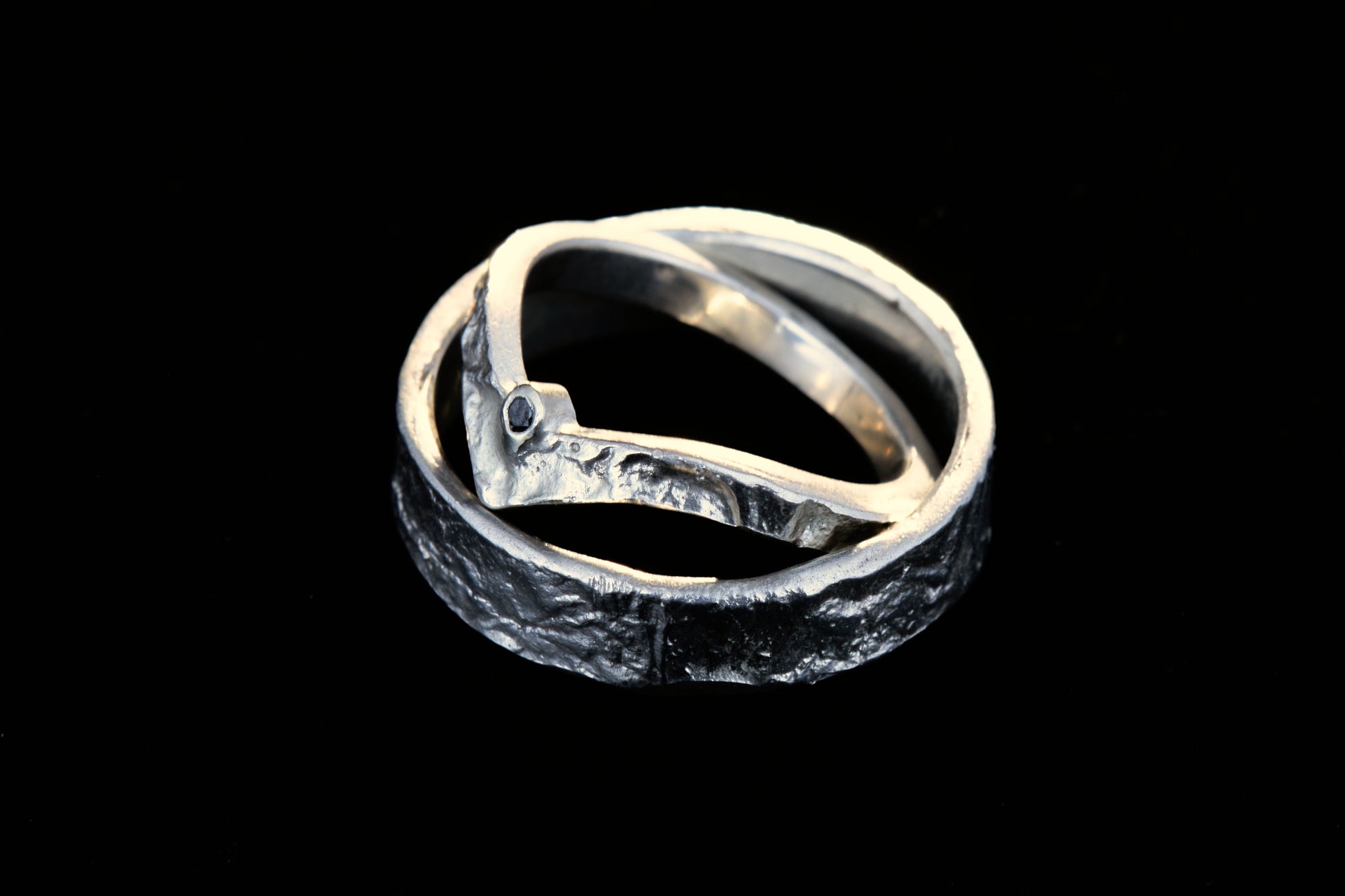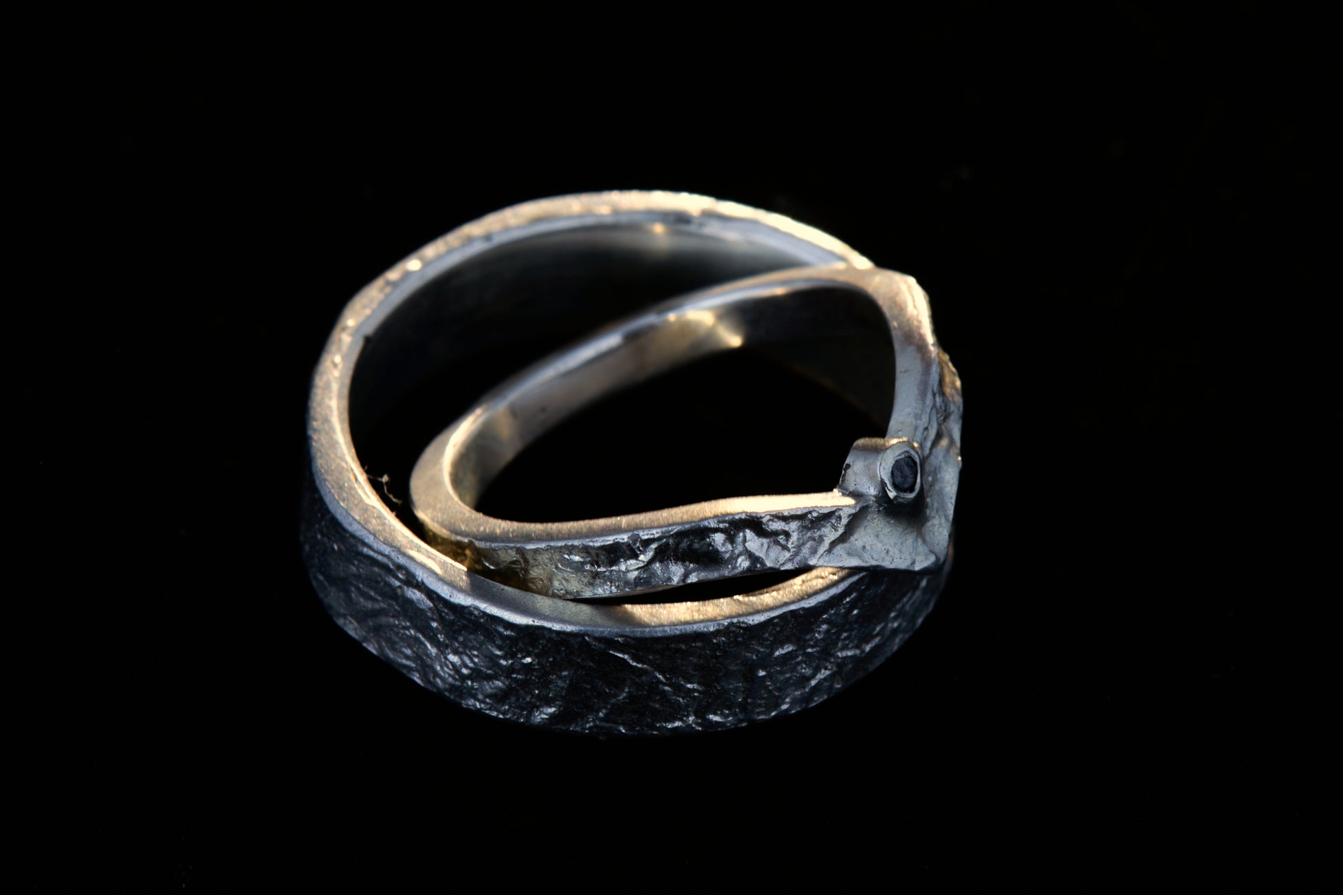 Der 2mm schwarze Diamant im Wishbone-Ring ist ein faszinierender Kontrast zur strukturierten Silberoberfläche. In der präzisen Zargenfassung kommt seine tiefe, geheimnisvolle Ausstrahlung besonders zur Geltung und verleiht dem Ring eine dramatische Eleganz.