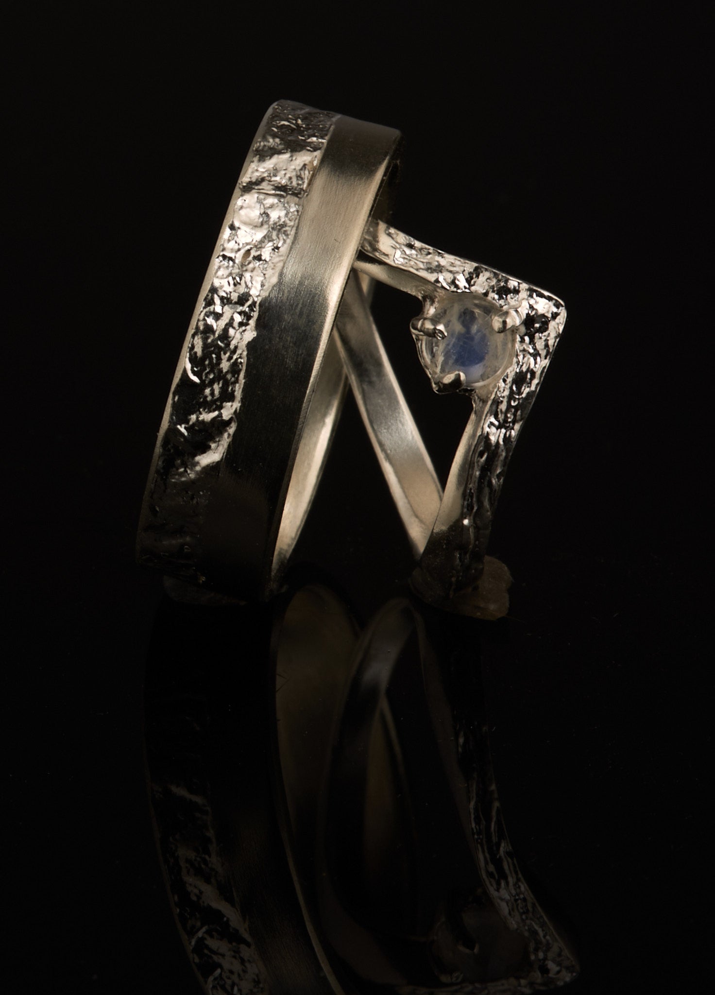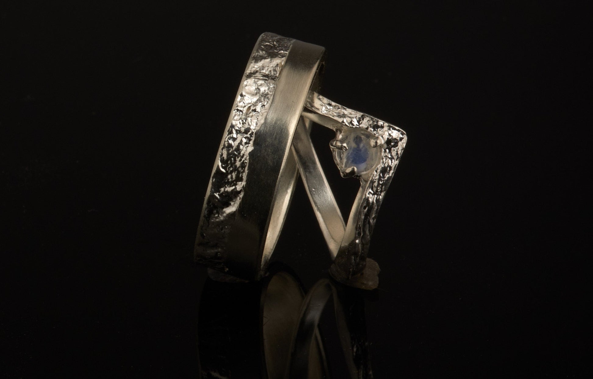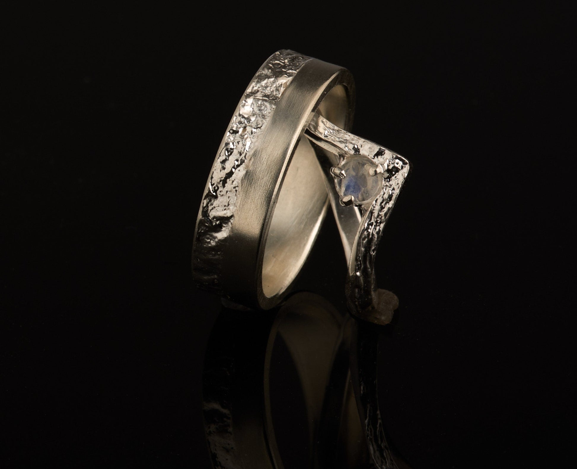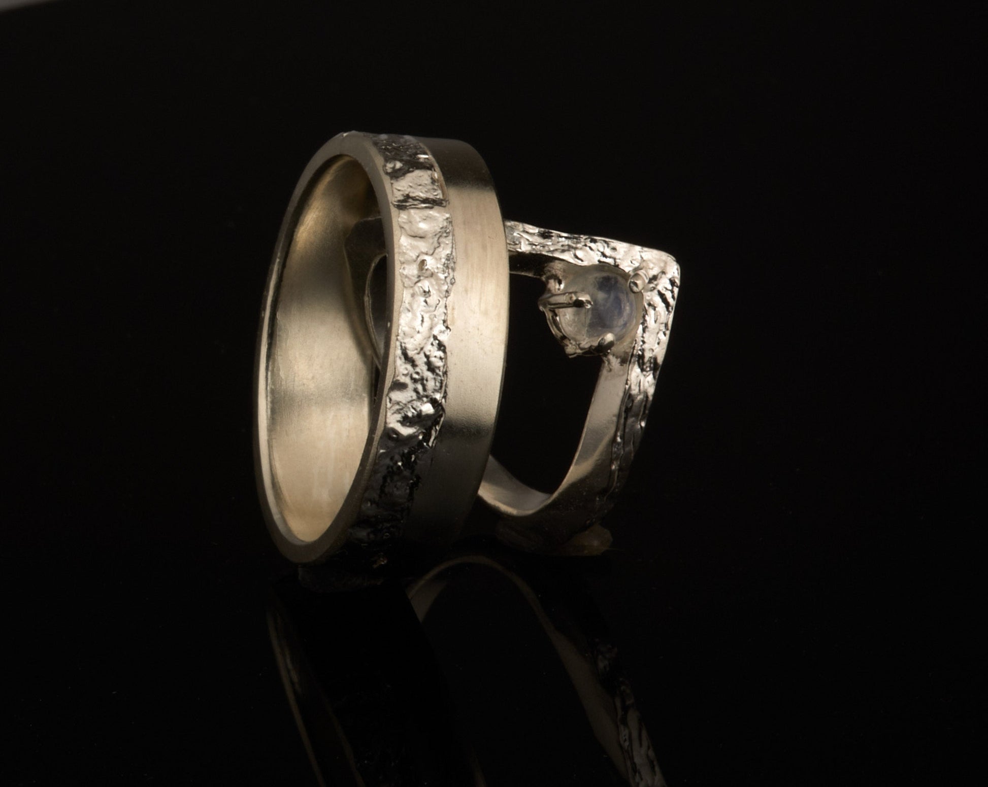 Der Damenring ist ein Wishbonering mit einer retikulierten Oberfläche und einer halbrunden, glatten Ringschiene, etwa 2mm breit mit einem 4mm Regebbogenmondstein Cabochon perfekt geeignet für zierliche Finger. Der Herrenring ist mit 6mm Breite, 2mm Dicke und einer retikulierten und stichmatten Oberfläche sehr maskulin und kraftvoll.