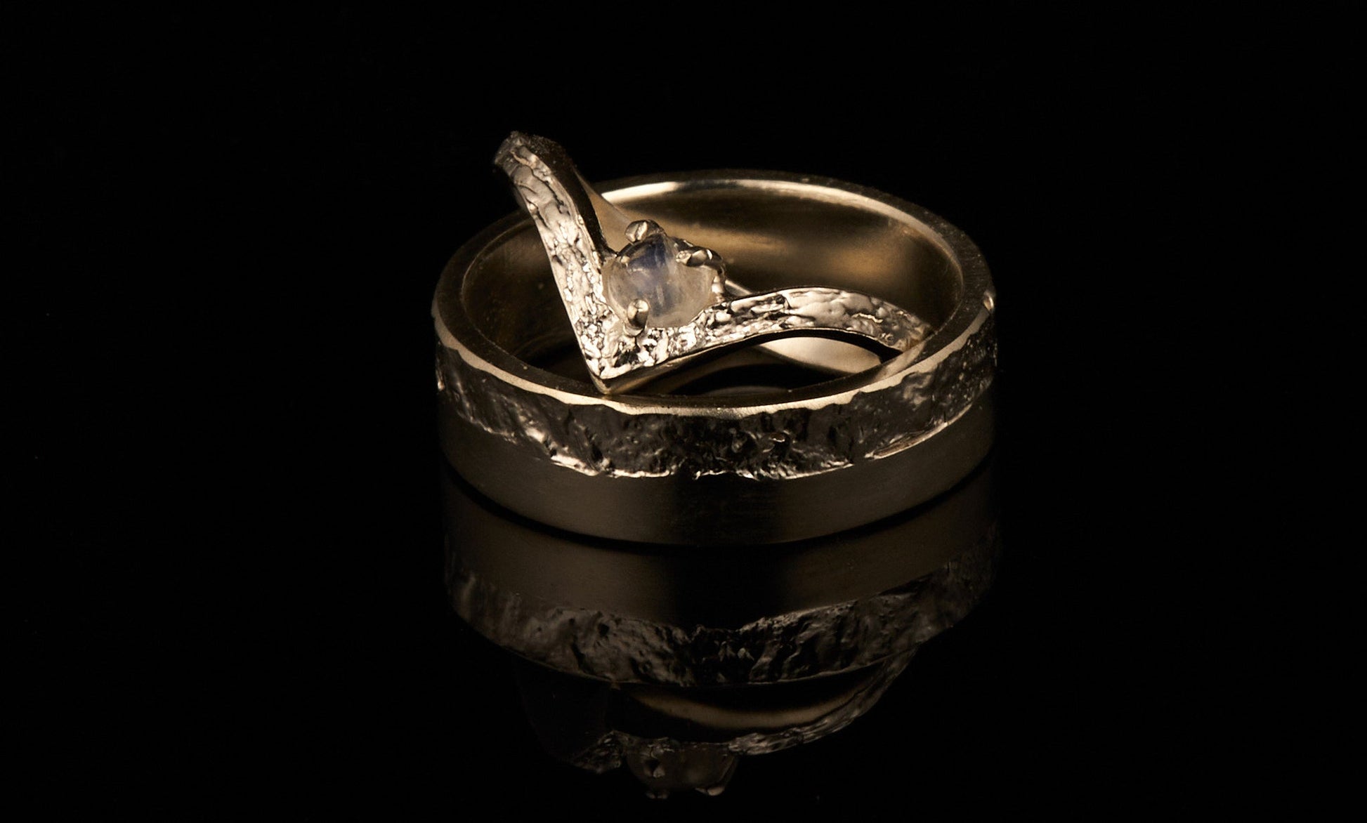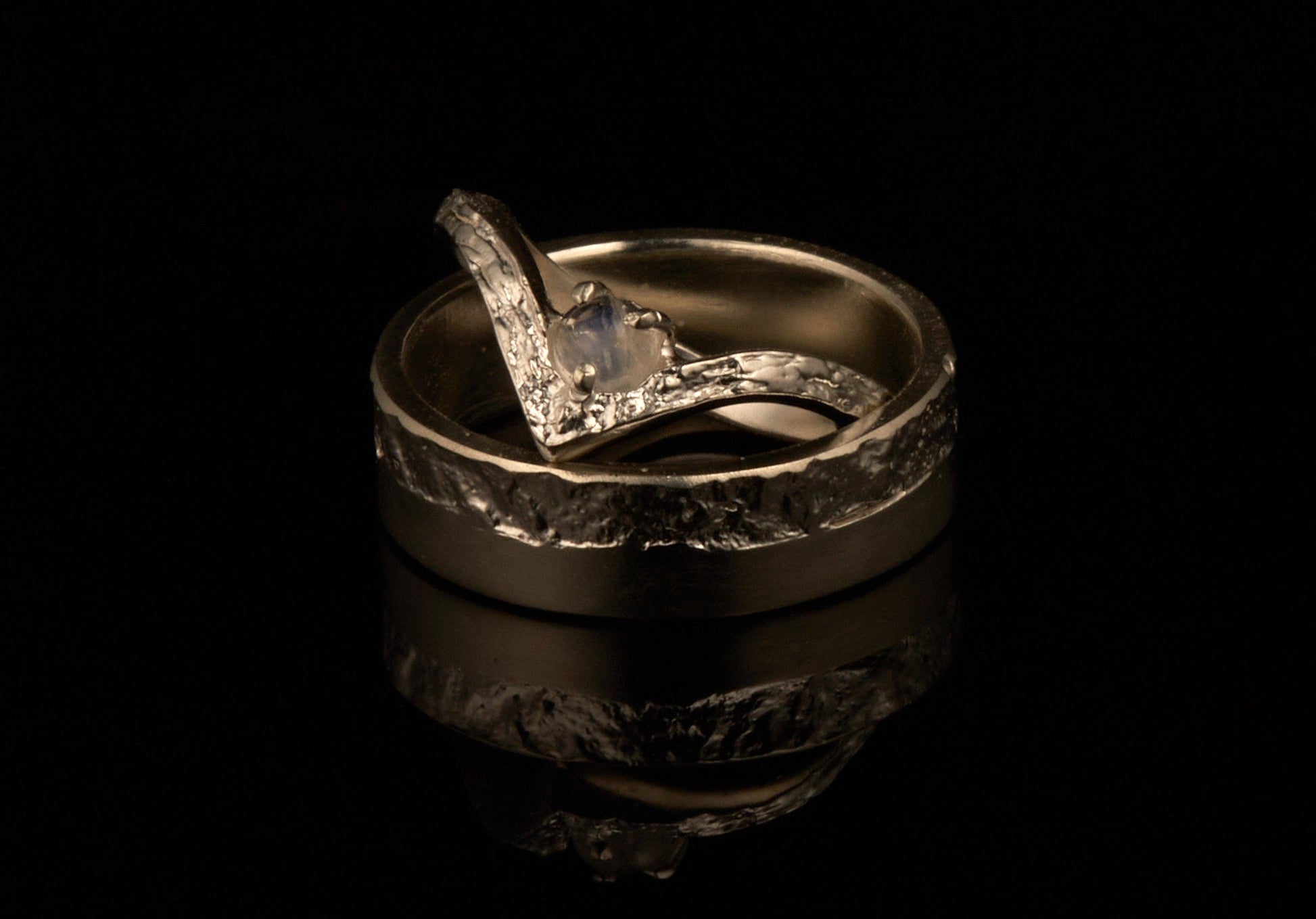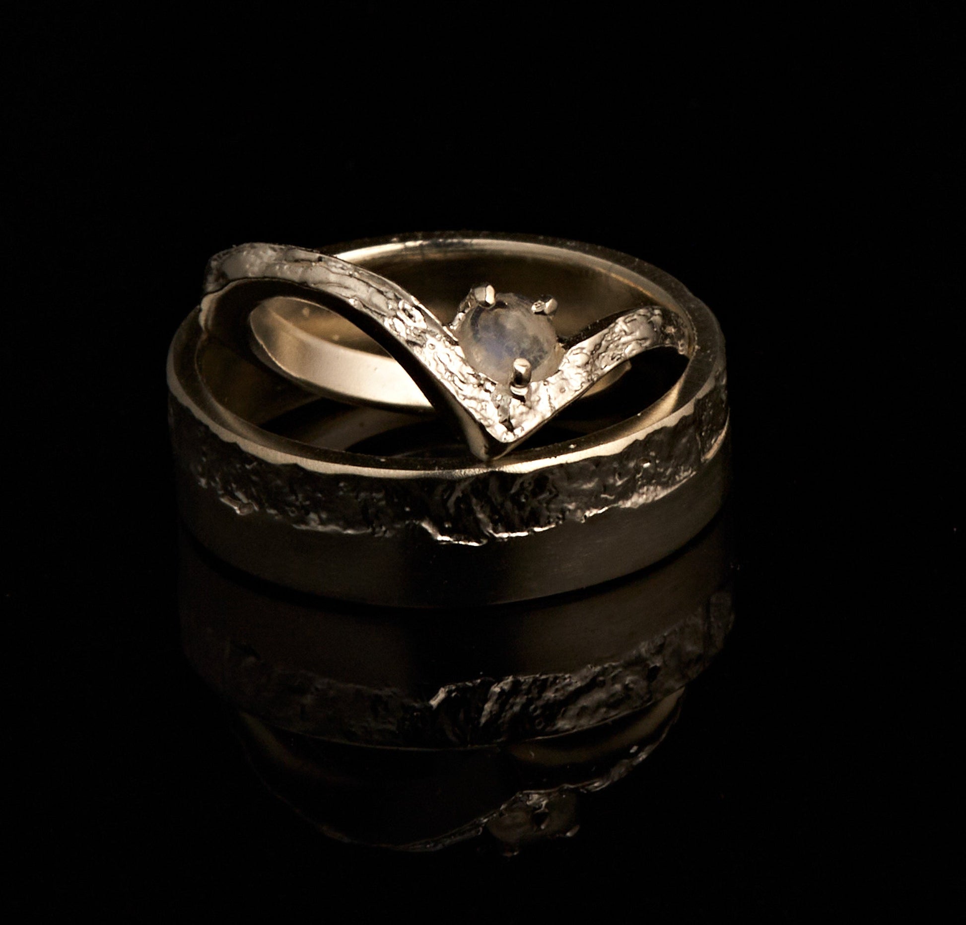Trauringe halb-halb mit Wishbonering und Regenbogenmondstein
