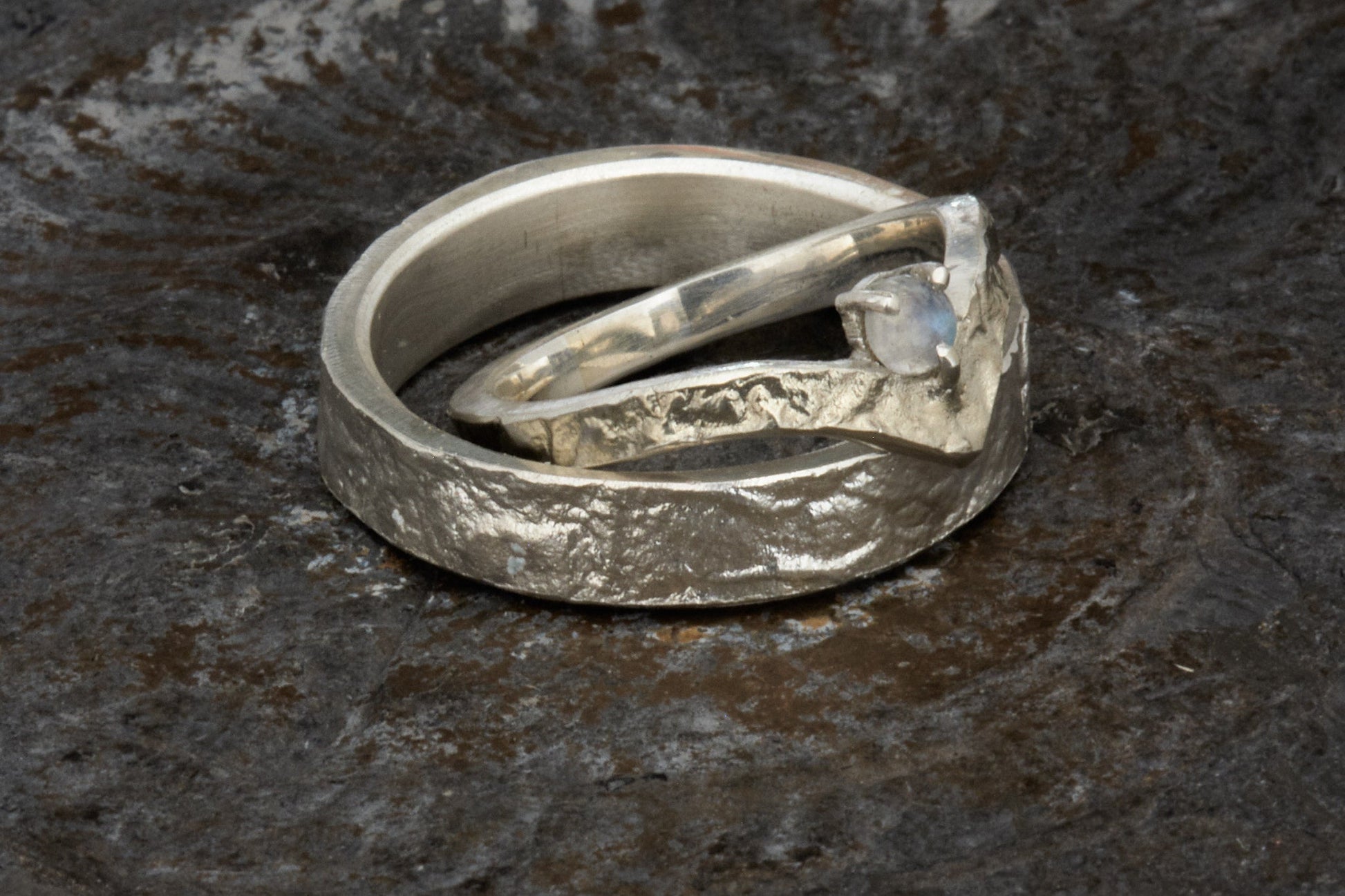 Der Damenring im eleganten Wishbone-Stil hat eine Breite von ca. 3 mm und ist ebenfalls 2 mm stark. Im Zentrum der Welle wird der Ring durch einen atemberaubenden 4 mm Mondsteincabochon geschmückt, der sanft in einer stabilen Fassung gehalten wird, die von drei Krapen gesichert wird. Der Mondstein strahlt nicht nur Anmut aus, sondern symbolisiert auch Intuition, Emotionen und neue Anfänge – eine perfekte Ergänzung für die Reise, die ihr gemeinsam antretet.